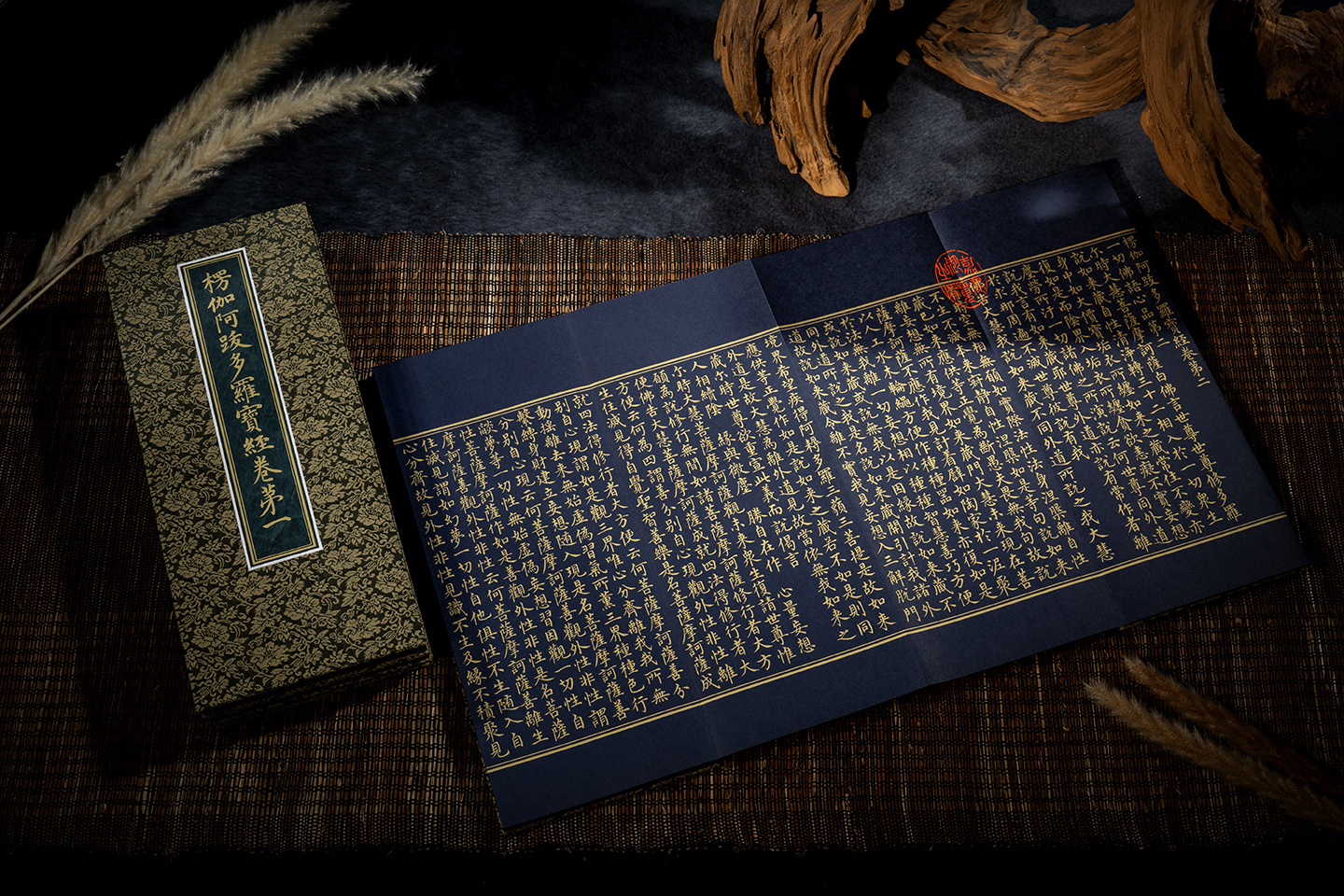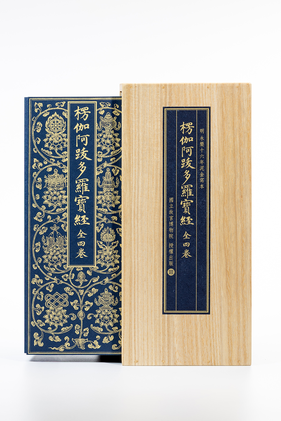 《楞伽阿跋多羅寶經》四卷,南朝宋求那跋陀羅譯,明永樂十六年泥金寫本,經摺裝四冊。羊腦牋書寫,半葉十行十九字,上下粗細雙欄。卷端題名,卷前扉畫皆作佛說法圖與經牌。