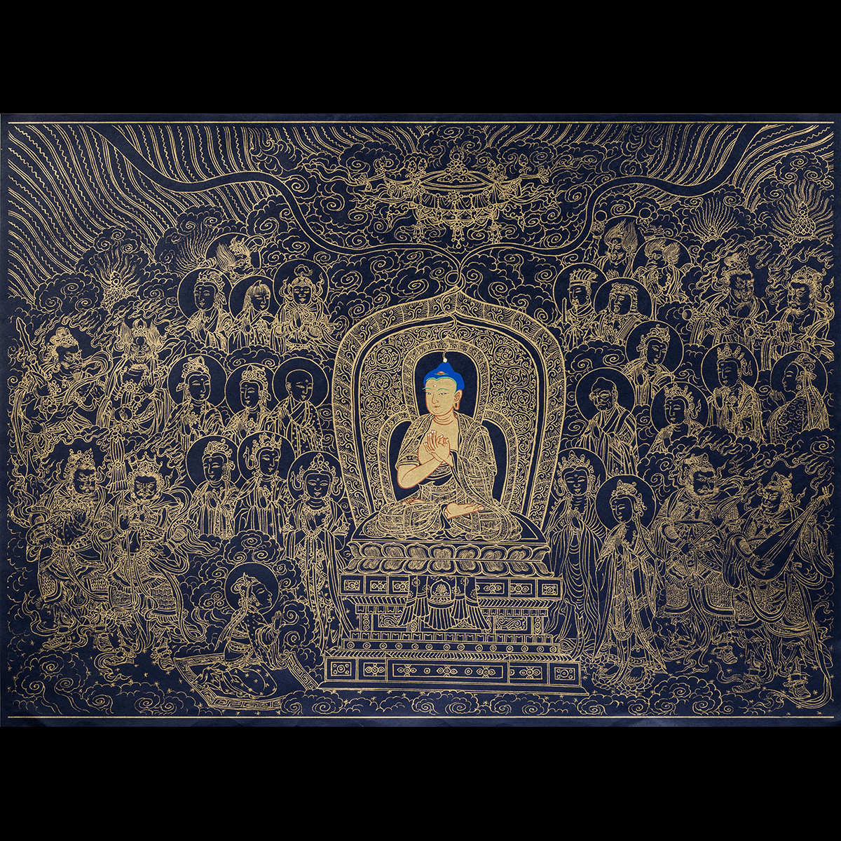 此部明代《圓覺經》,卷首為描金「佛說法圖」扉畫,佛陀髮髻以藍色標出,佛頂飾以白點,佛身袈裟亦具有紋飾,周繞四大天王、天龍八部,以及《圓覺經》十二菩薩,呈現明代宮廷漢藏佛教融合藝術的特徵;卷末則為韋馱護法泥金繪像。