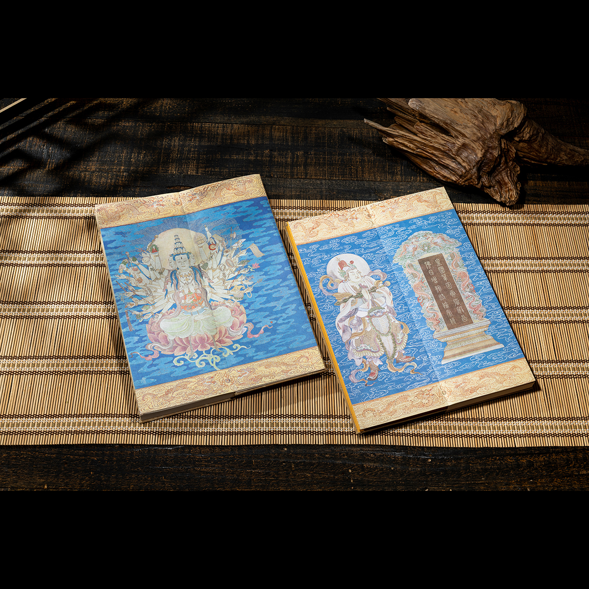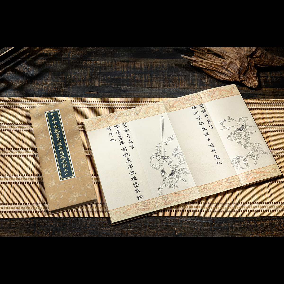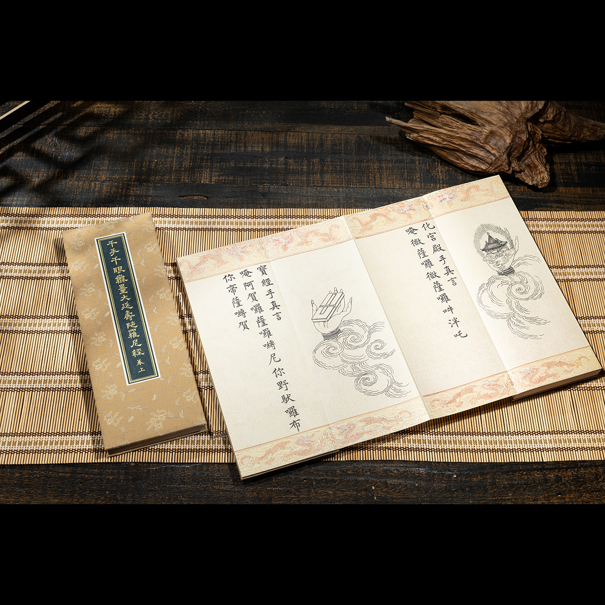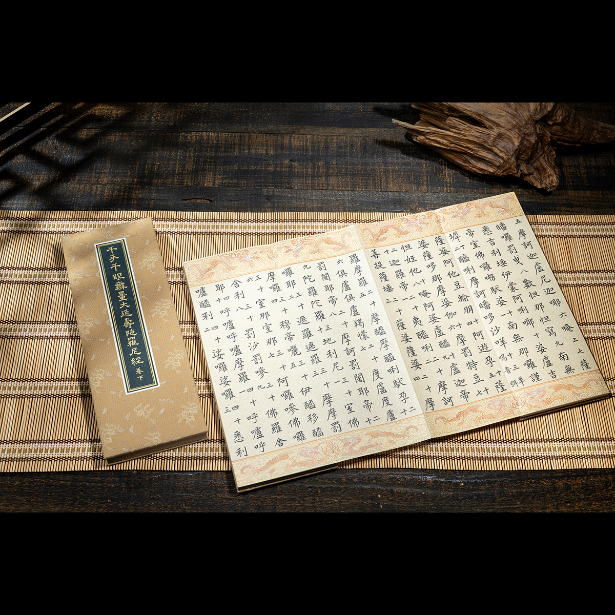 書頁材質為柘黃色絹織,卷前卷後分別附有彩繪的「千手千眼觀世音菩薩」與 「護法韋馱菩薩」聖像,經文上下彩繪216對雙龍戲珠紋為飾,繡畫工藝細致入微,為莊嚴華麗兼具之宮廷佳品。
